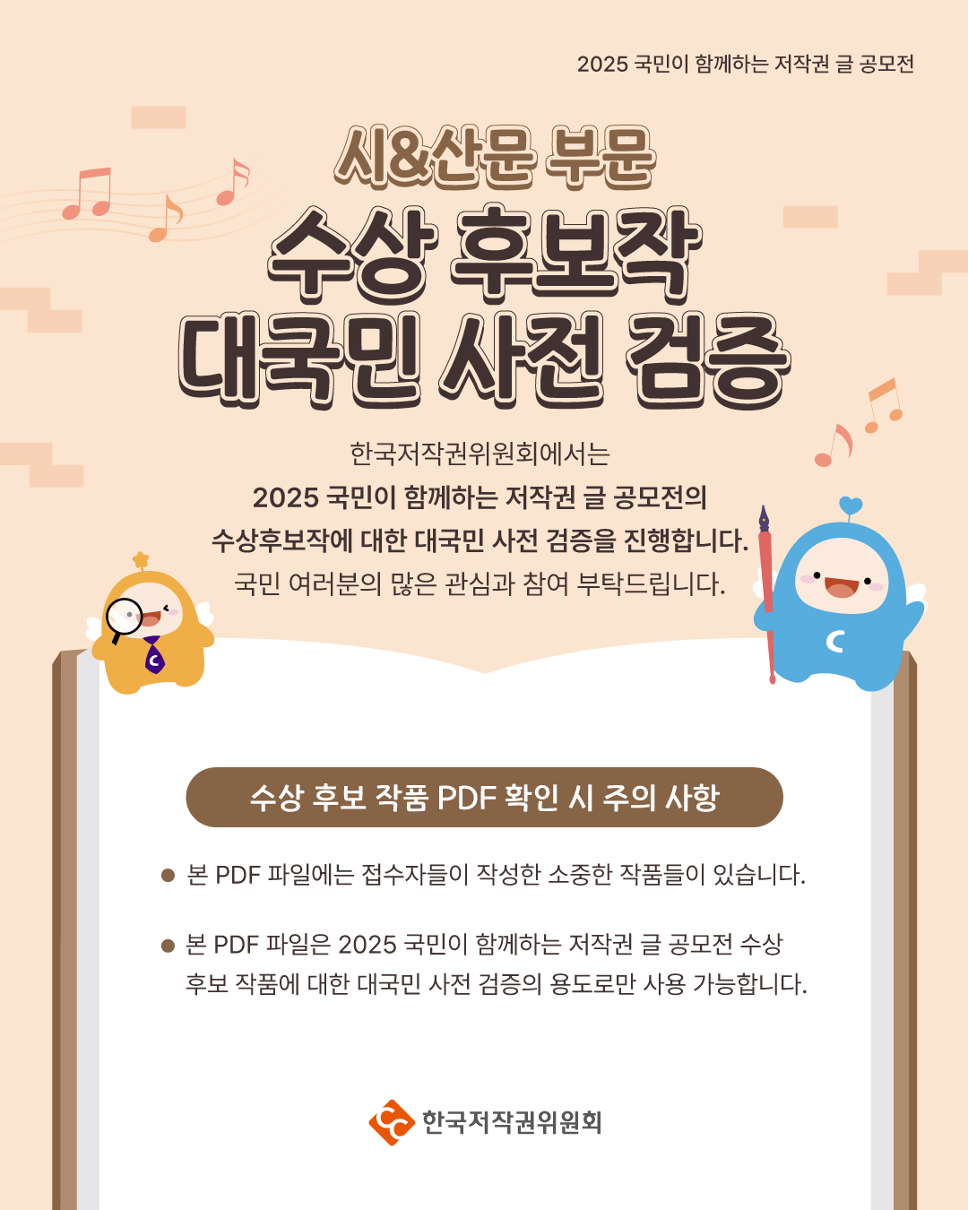 한국저작권위원회에서는「2025 국민이 함께하는 저작권 글 공모전」 시·산문 부문 수상후보작에 대한 대국민 사전 검증을 진행합니다.